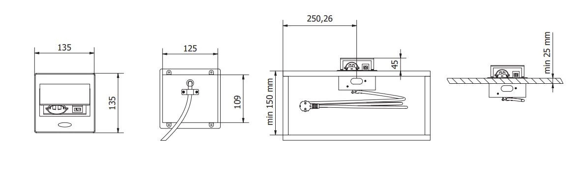 Dit stopcontact behoort tot de productklasse 'Stopcontact keuken' en is ontworpen voor gebruik in keukens. Het vereist een boorgat van 125x109mm voor installatie in het werkblad. Het stopcontact wordt eenvoudig gemonteerd en is klaar voor gebruik.